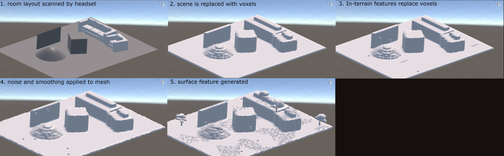 As part of an ongoing development for potential future projects I was tasked with taking an existing mix reality system that scans your play space and converts it into several voxels (3d variant of a pixel, or an equal division of 3D space) and using this data to generate a digital game scene. Part of this task was the creation of an algorithm to detect the non-neighboured face of the voxels to draw meshes. From here further work went into the techniques for mesh subdivision optimization. Through a number of combination and division steps mesh can be made to have few faces in areas of less importance and more faces in areas where higher detail is necessary to allow good performance without notice drop in quality. The second part of this process was taking the landscape mesh from a barren landscape to feature marked terrain. Using generative methods and several more voxel passing algorithms I created a system to create formations of varying voxel size and determined random location of the correct size to place them on the existing landscape. By using methods for random placement of pre-specified shapes the terrain generator will create a varied landscape on every new run regardless of whether the scanned room is the same or different.